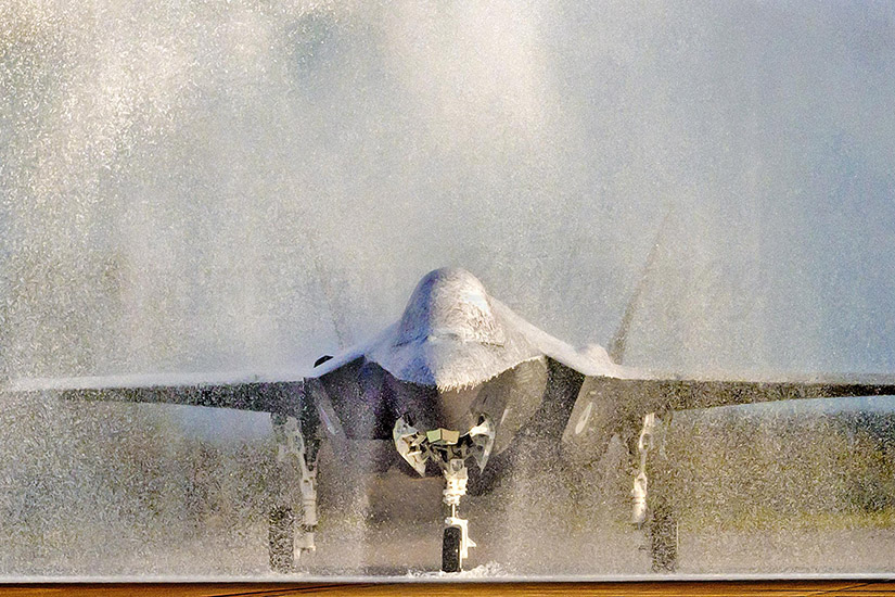 So taxiing through the water cannon arch the brand new fighter jet got doused with fire retardant foam and “Gladys” couldn’t see out of the window. Luckily he could use his tricked out helmet and special optical sensors on the aircraft to still see the marshaller and his surroundings. Something he hasn’t done before.