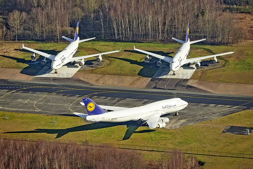Twente Airport saw a good business opportunity here to offer long-term parking availability. Deutsche Lufthansa became interested to store six of their aging passenger Boeing 747-400 Jumbo jet airliners as their routes were discontinued indefinitely. Indefinitely, because nobody knew how long it might take before service would pick up again. Also to do so with the wide-body, four engine, machines (that where scheduled to go out of service in the upcoming years anyway). A long-term storage at Twente Airport against a fee of some €10 000,- per wide-body per month looked like a good outcome against other options, keeping the uncertainty in mind of possibly bringing all or some back into service. Scrapping them all together was a bridge too far at the time.